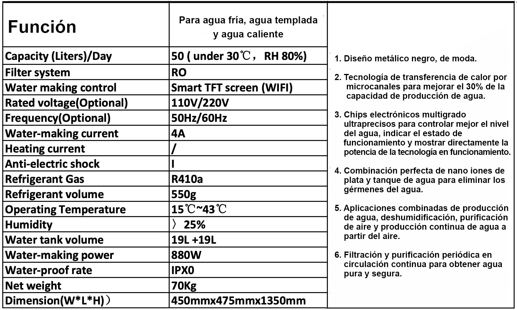 Ahorro de Energía Eficiente: utilizando la tecnología de conversión de frecuencia, solo 880 vatios pueden producir unos impresionantes 50 litros de agua por día.