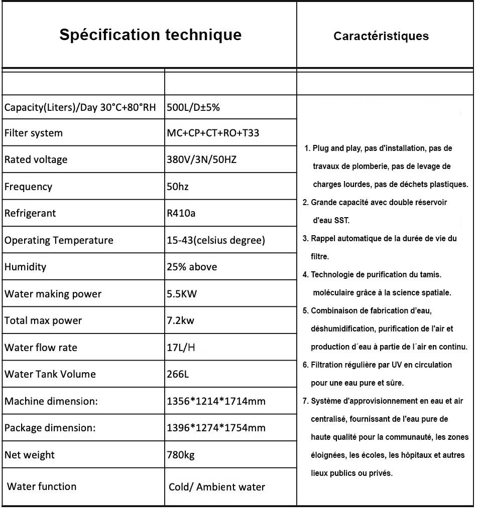 Cet équipement adopte une structure et une conception de contrôle spéciales. L'efficacité de la production d'eau est optimale en termes de consommation électrique.